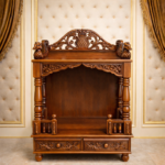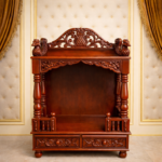 A premium hand-crafted wooden pooja mandap featuring traditional temple architecture, detailed hand carvings, decorative pillars, and storage drawers for daily pooja essentials.