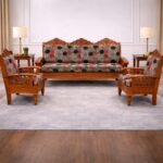 Finished in a rich hand-polished tone, the teakwood highlights its natural grain texture and enhances overall durability. Designed for traditional and classic interiors, this sofa set delivers practical comfort with lasting wooden strength.