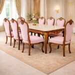 Gracefully designed for refined interiors, this 8-seater royal dining set in premium teakwood blends timeless craftsmanship with luxurious detailing. The elegant rectangular tabletop is enhanced with a smooth marble top, creating a sophisticated contrast between natural stone and warm wood tones.