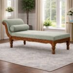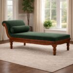 A timeless teakwood chaise lounge featuring a solid wood frame and premium upholstered seating. Designed with a gently curved backrest and sturdy turned legs, this elegant piece offers comfort and classic sophistication for refined interiors.