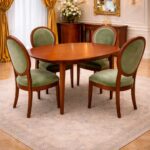 A handcrafted 4-seater teakwood dining set featuring a smooth oval tabletop and curved upholstered chairs for elegant and comfortable dining.
