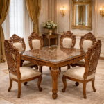 Crafted to reflect grandeur and timeless artistry, this royal 6-seater dining set in premium teakwood brings palace-inspired elegance into your dining space. Featuring intricate hand-carved detailing and a protective glass-top surface, this set balances visual richness with everyday durability.