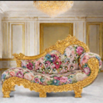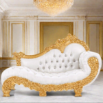 Make a powerful royal statement with this Grand Imperial Maharaja Teakwood Chaise Lounge, designed to reflect ultimate palace luxury. Crafted from premium solid teakwood, this masterpiece features exceptionally detailed hand carving across the entire frame. The rich gold-finished carved structure enhances its majestic presence and highlights traditional royal artistry at its finest.