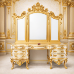 The majestic triple-panel mirror is crowned with an ornate carved crest, forming a grand architectural centerpiece. The extended console layout offers generous surface space and practical storage through multiple symmetrically arranged drawers. Each drawer is adorned with decorative antique-style handles and carved gold-accented borders that enhance its regal appeal.