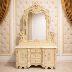 The soothing cream finish enhances the intricate carvings and adds a refined, premium look suitable for elegant bedrooms and luxury interiors. A tall, ornately framed mirror creates a striking visual statement while offering everyday functionality.