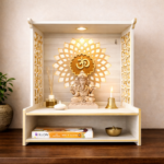 A compact MDF mandir featuring an illuminated Om back panel, open sanctum design, and lower storage shelf — ideal for modern and space-efficient pooja setups.