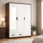 A modern solid teakwood 3 door wardrobe featuring a full-length mirror panel and bottom drawer storage. Designed for contemporary bedrooms, this durable almirah combines sleek aesthetics with practical organization.