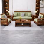 This complete set includes a three-seater sofa, two single-seater chairs, and a matching center table. The center table is designed with coordinated proportions and a strong teakwood structure, providing practical surface space while maintaining visual harmony.