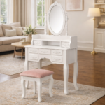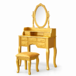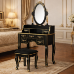 A compact royal teakwood vanity table finished in rich black with elegant gold accents. Featuring an oval mirror, multiple drawers, and matching stool, this handcrafted piece brings classic luxury and functional design to refined interiors.