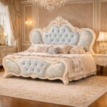 The beautifully contoured headboard and footboard are enhanced with plush button-tufted upholstery framed within intricately carved wooden borders. The soft curves and floral-inspired accents create a luxurious yet balanced presence, ideal for premium interiors.