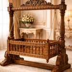 Designed for elegant nurseries and ceremonial occasions, this cradle functions as both a practical baby swing and a heritage statement piece. Its balanced structure and detailed craftsmanship create a timeless visual impact. Handcrafted in Saharanpur, India, it represents generations of fine wood artistry.