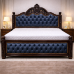 The Royal Blue Crest Teakwood Upholstered Storage Bed with Side Tables is crafted from solid teakwood and enhanced with ornate carved detailing and deep tufted panels. Featuring a built-in storage compartment and matching side tables, it combines royal elegance with durable construction and practical functionality.