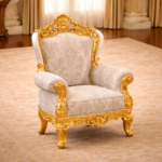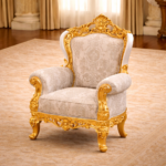 The elegant white upholstery complements the rich gold detailing, creating a refined contrast that enhances its royal presence. This complete set includes a spacious three-seater sofa, two matching single-seater armchairs, and a coordinating carved center table designed with harmonized detailing.