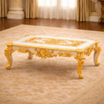 Introduce unmatched royal grandeur into your living space with the Royal White & Gold Maharaja Hand-Carved Teakwood Sofa Set with Center Table. Crafted from solid teakwood, this luxurious seating arrangement reflects palace-inspired elegance with intricate detailing and a refined white and gold finish.